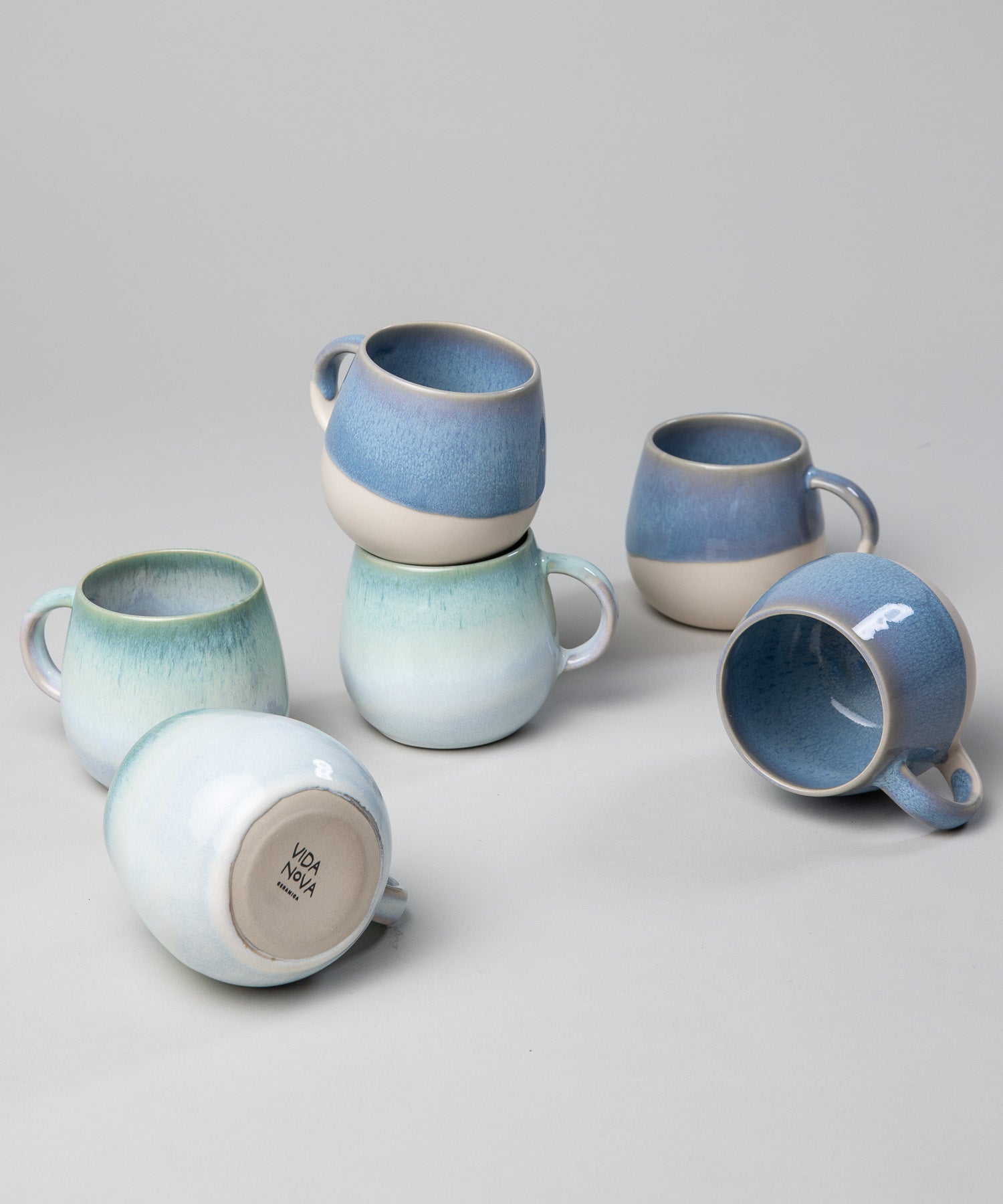 Blauer handgemachter Keramikbecher Água aus Portugal