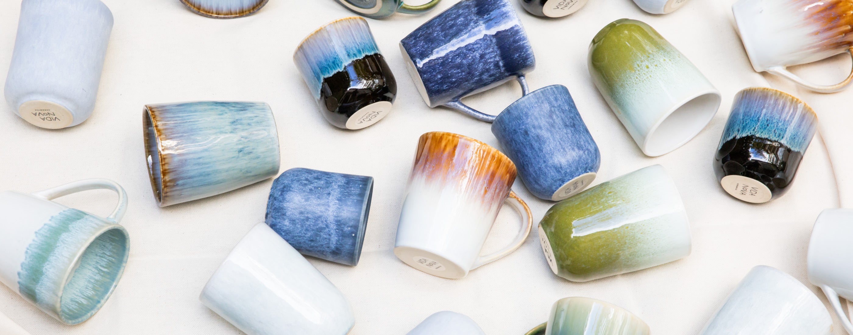 handgemachter Keramikbecher Flor aus Portugal in orange und blauZwei Flor Becher aus handgemachter portugiesischer Keramik
